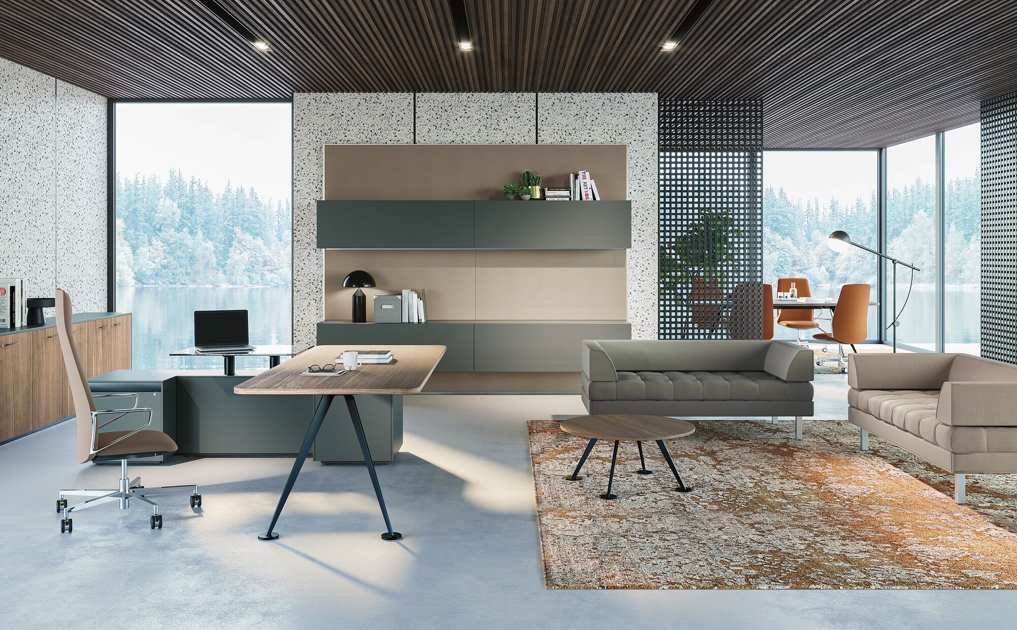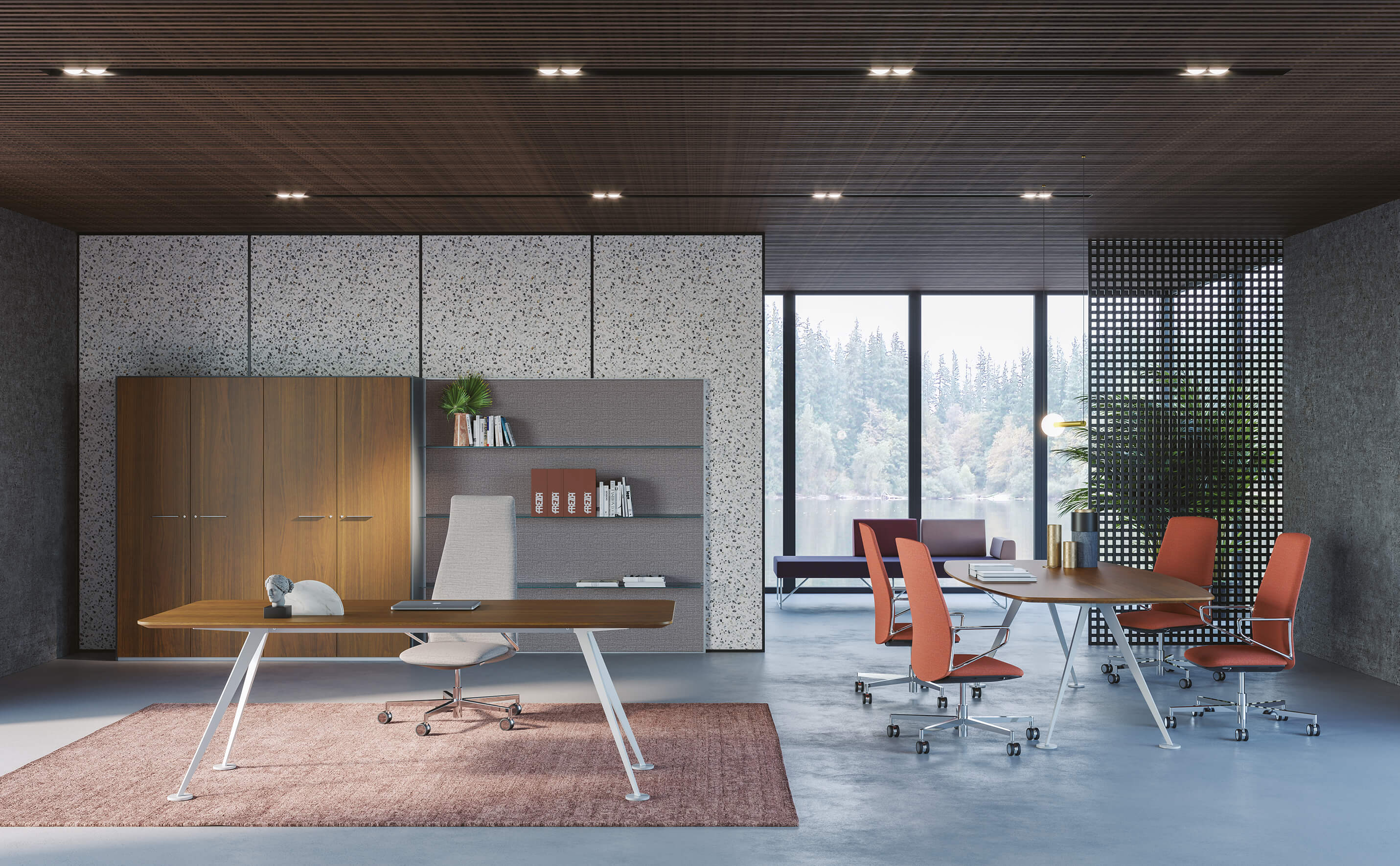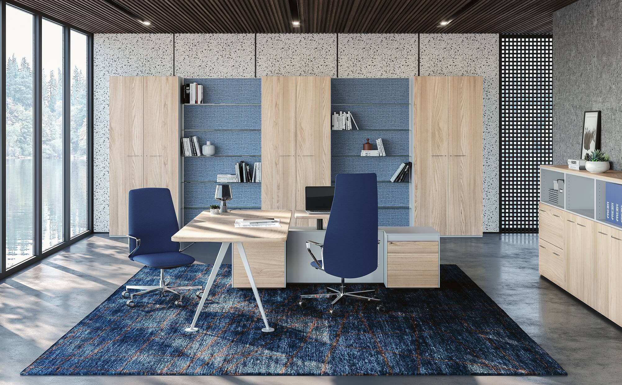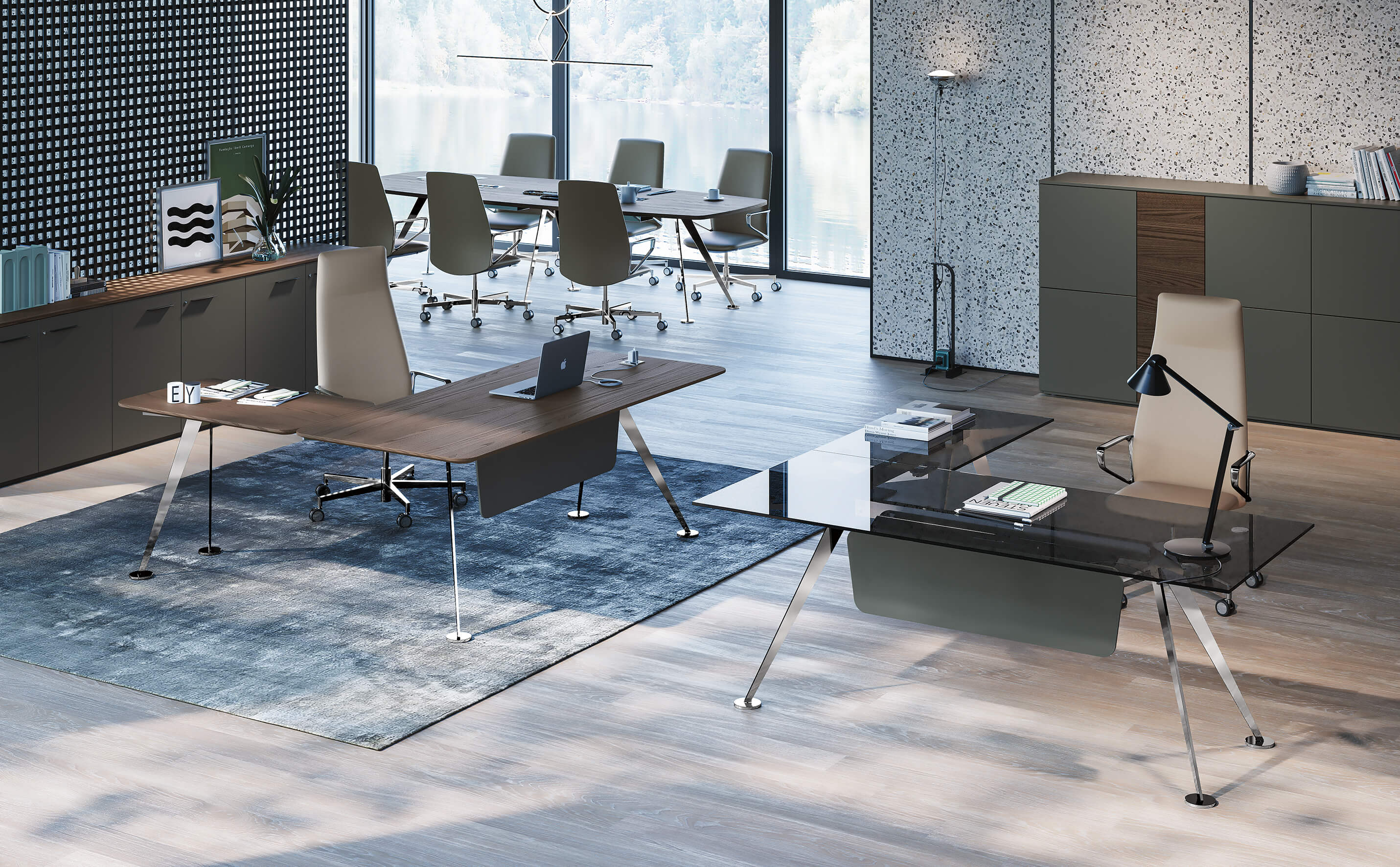 Spike is an executive collection with a unique design made of high-quality raw materials. A desk with sought-after lines, which looks aesthetically light but is made of extremely resistant materials, with a shape created by thick steel metal sheets, that represent the main element of the whole system. Thought for people who spend a long time in their offices, this collection stands out for the integration of a sit-stand system on the lateral return element, which allows you to change the height of your personal desk in a few seconds. A desk designed both to receive and to work by choosing the concentration and quality most suited to one's mental and physical well-being. The collection is completed by a series of meeting tables. The luxurious finishes, like polished chrome and black and white lacquered, match perfectly with the materials used to create the table tops, like wood, melamine or smoked glass.